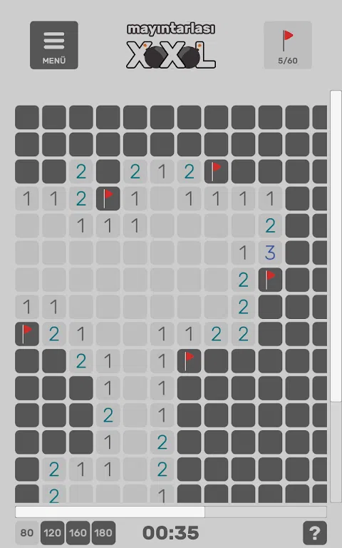 扫雷XXL是一款传统的扫雷游戏,20x20-25x25-30x30-35x35的巨大雷区等着你