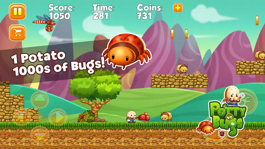 Super Potato vs Bugs Bros Potato 兄弟的超级经典传奇平台游戏:Mini Potty、Mario Potario 和 Super Potato 帮助 3 个超级土豆踏上冒险之旅。这些超级兄弟拥有不同的超能力。 Mini Potty 是家里的小孩子,Mario Potario 是中间的孩子,Super Potato 是大哥哥。 4 个充满敌人的世界:虫子。 8 个超级虫子大佬保卫他们的城堡。萨巴纳、丛林、沙漠和地下洞穴、秘密价格和关卡、天空和水域,免费游戏中的许多场景。 怎么玩: 4个世界,多种场景: 错误: 瓢虫、黄蜂、蜜蜂、甲虫、蜻蜓、螳螂、狼蛛、蚊子、蚱蜢、蜘蛛是您在马铃薯兄弟的超级世界中冒险时会发现的一些敌人