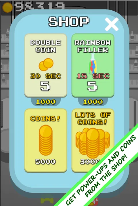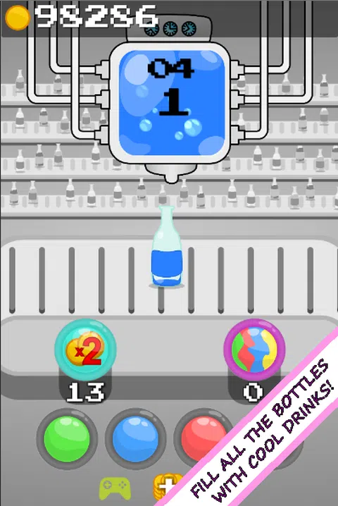 装满尽可能多的瓶子。最重要的是,收集硬币! 旋转传送带的速度随着每一波而增加。确保不要错过瓶子,否则会让老板生气!他会从屏幕上飞进来,做出一个愤怒的表情。 3 次未命中将结束游戏,但不用担心,您可以免费观看广告从上次中断的地方继续,您还可以获得观看广告的金币。硬币可以用于加电。请注意,这不是饮酒游戏。保持冷静!不要生气!对于一些休闲游戏,请立即下载游戏,或者在周五或周六下载游戏,然后用灌装瓶填满您的周末。现在带着你的液体机器旋转一下,享受快乐的瓶子灌装