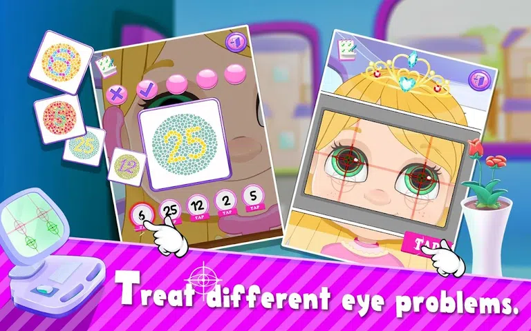 医生,这些病人需要您的帮助!以风格对待患者!从 6 位可爱的病人中进行选择,开始享受医生的乐趣吧! 成为最好的眼科医生!使用特殊的医疗工具来睁开眼睛,去除细菌并杀死不需要的细菌!摆脱红眼病、进行疯狂的色盲测试、测试视力等等!用彩色隐形眼镜展现您的风格!您甚至可以设计自己的眼镜!谁知道当眼科医生这么有趣?! 特征: > 点击从 6 个可爱的角色中进行选择! > 对抗细菌,预防眼睛腐烂! > 进行疯狂的色盲测试! > 测试一下视力! > 用疯狂有趣的隐形眼镜来装扮你的病人! > 用您最喜欢的形状和颜色设计您的眼镜! > 探索主题设置