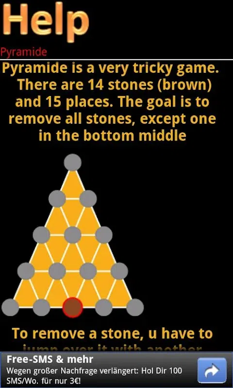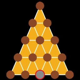 金字塔是一个非常棘手的游戏。 有14块石头(棕色)和15个地方。目标是消除除底部中间的一颗石子之外的所有石子。 要移走一块石头,你必须用另一块石头跳过它。因此,选择一块石头并跳到可用的位置。 所有可用的动作均以绿色表示。有时可能还有更多的动作。 如果没有剩余动作,您必须重置游戏并从头开始