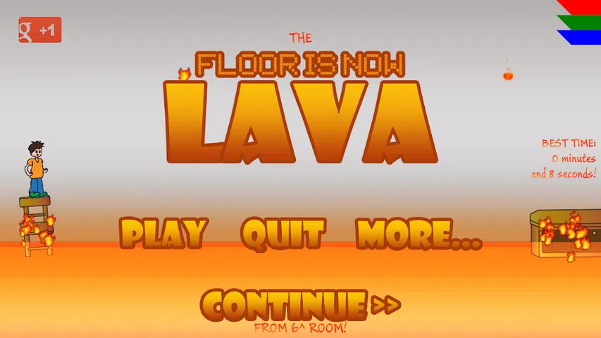 地板现在是熔岩。 它正在燃烧一切。 你也是。 避免火焰,避免熔岩,将脚放在安全区域。 到达安全的地方。 你失败了?重试。 在菜单和游戏结束时检查您的时间! 最好的时间将在标题室! 如果您遇到“不合适的控制”,请写下您的智能手机型号。 几秒钟后广告消失,或者您可以将其关闭