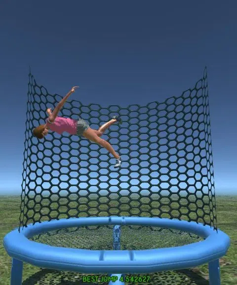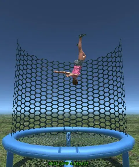 欢迎来到运动蹦床公园模拟和一个简单的游戏只是弹跳着陆,使更高和更高的跳跃作为一个下降在游泳池