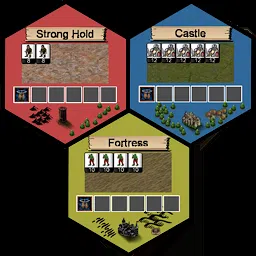 故事发生在上古时代,人族、兽族、龙族并不是和谐相处的。 兽族和龙族为了争夺资源大举入侵,人类为了守卫家园,与龙族和兽族展开了旷日持久的战争。 每个格子就是一个必争的阵地。 在里面建造兵营、征召士兵,同时需要使用一些策略,否则的话人类的体质是无法与龙与兽对抗的。 玩法说明: 1、兵种说明: 人类拥有民兵、弓箭手、法师、投石车。其中民兵是基本兵种,不用建造任何设置即可生产。其余三个兵种需要先建造相应的建筑。 比如你想要在某个格子里面生产弓箭手的话,你需要先在该格子里面建造“射箭场”。 兽族拥有兽人、恶魔、妖精、亡灵机车。其中兽人也是最基本的兵种。其他三个需要有建筑支援才能生产。 比如你想要生产妖精,就需要先建造“女妖巢穴”。 龙族拥有矮人、石像鬼、掷弹兵、龙。小矮人是无需建筑即可生产的基本士兵。其余三个需要相应的建筑。 比如要生产龙的话,需要先建造“龙穴”。 2、建筑说明: 除了每个种族的基本兵种不需要建筑外,其余兵种均需要有相应建筑才能建造。 人类建筑:“射箭场”可生产弓箭手,“魔法树”可生产法师,“铁匠铺”可生产投石车。 兽人建筑:“地牢”可生产恶魔,“女妖巢穴”可生产妖精,“兽人铁匠铺”可生产兽族的亡灵战车。 龙族建筑:“黑暗之塔”生产石像鬼,“炼金实验室”生产掷弹兵,“龙穴”生产火龙。 除了各个种族特有的建筑外,还有一些特别建筑。 了望塔:拥有少量的防御力,建造后可增加相应格子的防御值。 防御箭塔:比了望塔的防御力稍高,增加总体防御值。 魔法塔:被施加了魔法的塔,它有更加强大的防御力。 魔法护盾:给予该区域所有士兵一些额外的防御力,具体增加值视兵种而不同。 生命之源:给该区域所有士兵提供额外的生命值,在相同防御力的情况下,会更难杀死,具体增加值根据兵种不同,也会有所不同。 运输车:可以提高指定格子的生产效率和生产能力,增加指定格子的收入25%。 3、魔法道具: 目前有下面几种道具可用: 补满士兵:当一队士兵战斗过之后,各个士兵单位的兵力可能会有减少,这个时候使用该道具,就能立即补充兵力,将各个士兵单位兵力补满。 比如人族,一队普通士兵有12个单位,战斗过后也许只剩下2个。使用道具后,该队士兵立刻会重新征召10个士兵,用以补满12个单位。 超时空移动:可以将指定的两个格子内的士兵进行调换,游戏中你只能从相邻的两个格子之间派遣士兵。但是使用这个道具,可以将不相邻的两个格子之间的士兵完全调换。 比如一场战斗后,你的格子里只剩下很少士兵了,而此时敌人格子里面还有很多士兵,你又没有足够的钱去生产士兵,那么就可以将远处士兵充足的格子与该格子进行调换。 鸡血针剂:游戏中每个士兵一轮操作里面只能战斗或者调兵一次。必须等到下一轮才能继续活动。而此时,使用鸡血针剂,将可以使已经不能活动的士兵在本轮就能重新活动。 4、操作说明: 游戏中只能操作己方阵营的格子,在萤幕上点击该格子,立刻切换为选中状态。 选中格子后,可以给该格子建造建筑,生产士兵。 在选中格子的状态下,可以通过点击或者拖拉选择框,选中该格子中的可用士兵。以开始战斗或者移动。 选中可用士兵后,会有指向不同方位的箭头,红色表示敌对势力,蓝色表示友方势力,点击红色箭头即向箭头指向格子发起进攻。点击蓝色箭头,即向指定格子移动士兵。 你可以根据情况,点击萤幕右上角的“下一月”按钮,跳过本轮操作,等待其他势力完成后,就会进入新的一轮,你又可以操作了
