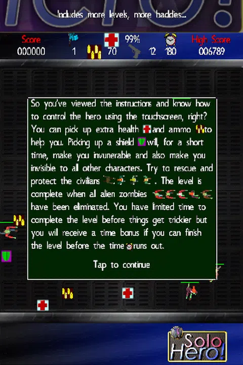 Solo Hero 是一款自上而下的街机射击游戏,其中加入了一些策略。上手易玩难放下,变化无穷。 玩家必须在生存与试图拯救尽可能多的平民之间取得平衡。平民可以放牧,也会为你聚集;但他们可以表现得喜怒无常,所以必须小心让他们跟着你。为了最大化您的救援奖金,您必须在每个级别结束时拥有尽可能多的追随者。追随者会消耗你的健康来恢复他们的健康,但如果他们处于最大健康状态而你没有,则会自动收集额外的健康并治愈你。尽量让他们保持健康,以增加您的关卡奖励。平民,无论他们是否是你的追随者,都对你的行为以及各种掠夺性的恶作剧很敏感。所以要小心谁在交火中被击中;这也适合你! 卡通风格和对有趣游戏的强调确保适合大多数观众,但不要误以为它不会提高你的脉搏率。想象一下,您刚刚在唯一没有脏东西的区域引发了连锁反应!或者,也许你正直奔外星僵尸大军,却发现你的弹药已经用完了!或者。好吧,我们确定您已经掌握了图片。 特征。 那么今天为什么不试试单人英雄呢?太棒了! 这个免费试用版包含早期级别,以便熟悉。此版本包含广告