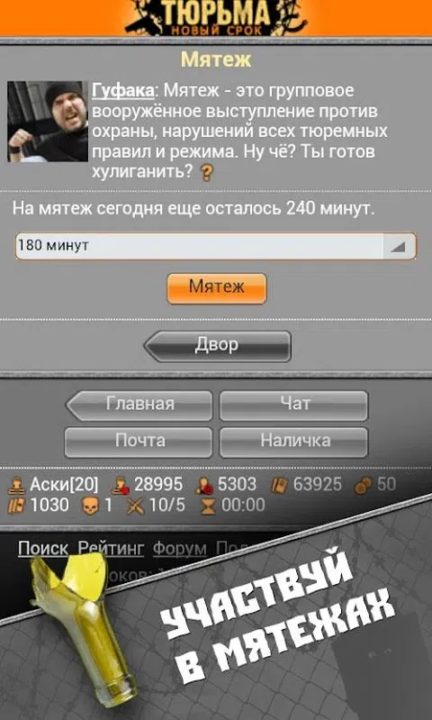 随心所欲地向往吗?向区域前进!随着游戏“监狱。新名词“别无聊!全力以赴战斗,向朋克展示这个地方,创建旅并争取 Bratva 的支持!是时候成为一个很酷的在线权威了! 移动多人在线游戏“监狱。新名词”绝对是格斗游戏的热门话题。独联体成千上万的用户因其非标准的情节和有趣的笑话而爱上了这款游戏。快来加入,控制一名斗士,在摇椅上训练他并照顾他的装备,争取新的成就和更高的水平! 在我们的在线“监狱”中,您会发现严酷但令人兴奋的日常生活!要开始使用,请查看 Point 购买所需的一切,包括、枪支、刀具和装备。将你的意志凝聚成拳头,定期遵守命令,不要忘记跑进去向图书馆的教授学习生活。当然,不要错过在游戏室玩得开心的机会—这会很艰难! 您还将在游戏中成为: ● 庭院工作 ● 武装叛乱 ● 与流浪教父的危险战斗 ● 与鸬鹚对决 ● 可怕的屠杀 ● 冒险团伙逃跑 ● 酷炫的 Shmon 相机 ● 大折扣等等 使用游戏“监狱”的所有功能。新的截止日期!与您的朋友聊天,邀请新的可靠战士加入游戏,并以旅和 Bratva 的形式获得坚固的屋顶!任何问题?有一条出路 - 在论坛上解决它们。 医疗单位的程序和内阁提供的资金将帮助您在监狱中获得尊重。如果这很困难,不要犹豫,使用 Shnyr 的帮助—他绝对不会陷害你