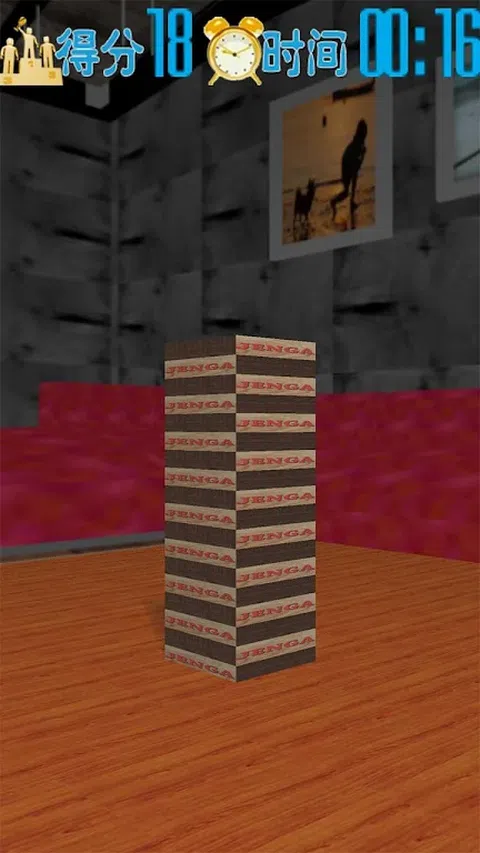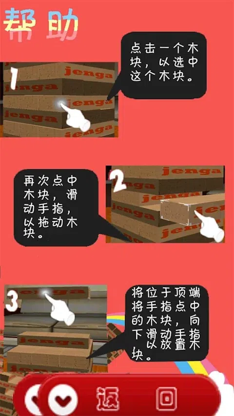 在游戏中,玩家交替从积木塔中抽出一块积木并且使其平衡的放到塔顶,去创造一个不段增高,越来越失去根基的积木塔,直到积木塔倾倒。 点击一个木块,以选中这个木块。 再次点中木块,滑动手指,以拖动木块。 将手指点中的木块,向下滑动手指以放置木块
