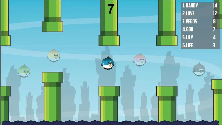 Flappy io - 看似简单的游戏,画面却非常精美,多人在线游戏,你需要牵着一只挥舞着翅膀的小鸟,在管道之间,毫发无伤,超越所有对手! 你按下屏幕,小鸟发出一声哨子,一点点飞起来,然后开始落下。 但是,如果您在起飞或高峰时至少触摸了一点绿色或白色的管道,那么一切都将不得不重复。 游戏中有4张牌: -早晨 -晚上 -创意日 -秋天的晚上 如果你飞近 - 不要生气,因为即使得几分也不是那么容易