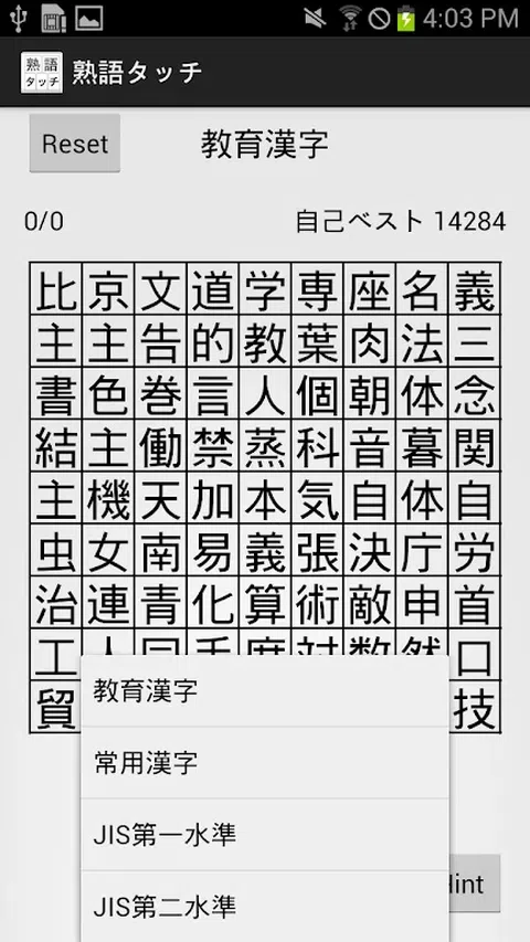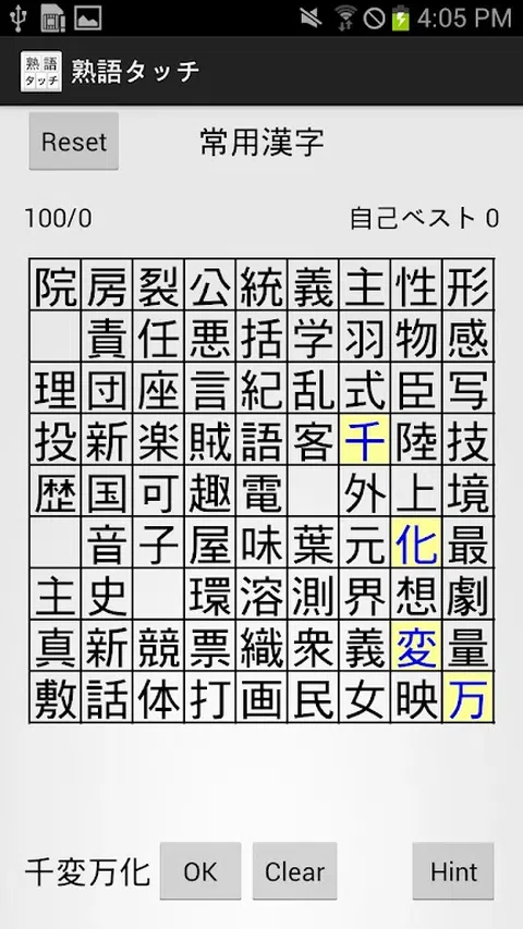 这是一个游戏,您可以从打乱的汉字中搜索 2 个字母、3 个字母和 4 个字母的成语并通过触摸它们来删除它们。 您可以玩 4 种类型的游戏模式,从用于教育和日常使用的基本汉字到困难和超困难 JIS 1 级和 JIS 2 级。 不仅可以扩大日语词汇量,还可以作为记忆力和周边视力训练等大脑训练来享受。 *怎么玩* ・在黑板上寻找两个字母、三个字母和四个字母的成语,并按顺序触摸它们。 ・完成成语后,按OK键进行判断,如果答案正确,字符会消失。 ・删除60字以上时,满足通关条件,会出现“下一步”按钮,进入下一关。 ・按下提示按钮会消耗当前分数的 100 分,并显示一组两个字母的成语。 *评分规则* ・2字、3字、4字成语分别加10、50、100分。 ・创建两个字母、三个字母或四个字母的习语时,打开的帧数增加了 1x、2x 和 3x ・在没有提示的情况下擦除 60 个或更多字符可获得 500 分奖励 - 如果您在没有提示的情况下完全通关,则可获得 10,000 积分奖励 *规格* ・关于正确答案判断 用于判断正确答案的内部词典有大约 42,000 个两个字母的成语和大约 26,000 个四个字母的成语的词汇。 这是一个比 Kojien 等大型日语词典更大的词汇量,但仍然不可能涵盖所有的成语。 因此,专有名词、专业术语、生词、造词等即使是正确的也不一定被判断为正确。 有许多变体,例如“〜目标”和“〜原则”,它们可能正确也可能不正确。 这个游戏的关键是寻找“可能出现在一般日语词典中的常用成语”而不是“所有成语”。 ・完全清除 设置问题时,不随机给出单个汉字,而是根据字数选择内部词典中的成语,将字符打乱显示。