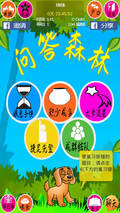 [ 请选择Google TTS (Text-To-Speech) 。] 三种单人游戏:眼急手快、积少成多、大步流星。 两种多人游戏:捷足先登、成群结队。 四个科目:语言、历史、娱乐、常识。 二到六人或电脑玩家共同竞赛。 与宠物沟通互动。 逼真时间背景。 详细排行榜。 领养宠物。 语音聊天。 动物搏斗。 种树。 马上提升您的知识
