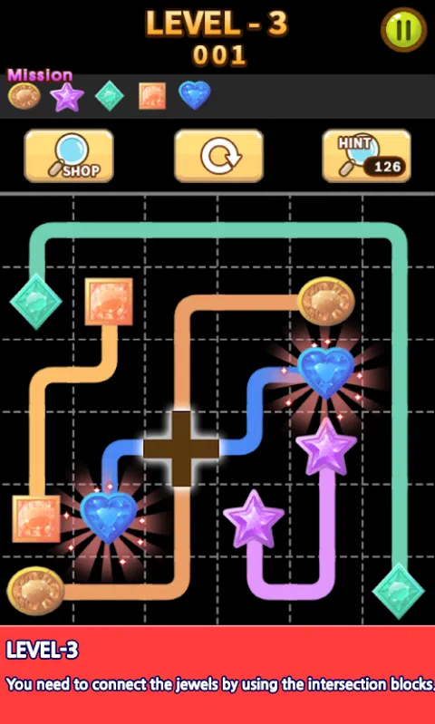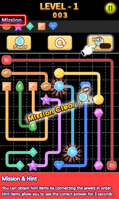 ※即使没有付出,就可以得到关于免费充电站的足够信息。 连接相同宝石用线。 当所有的宝石相连的阶段已被清除。 空的空间抱你回清除阶段。 ※注意文章 - 显示3秒钟正确的答案。 ※使命 - 当你完成任务后,你可以得到一个提示条。 ■级别1 行可以在所有四个方向(上,下,左,右)连接。 ■2级 避开障碍物,并连接所有的珠宝。 ■3级 两条线可以通过交叉路口交叉 ■4级 对角线的连接应采用连接珠宝。 ■5级 连接宝石按数字顺序(1→2→3) ■6级 避免的障碍,并以数字顺序连接的宝石 ■7级 交叉的交叉点,并以数字顺序连接的宝石