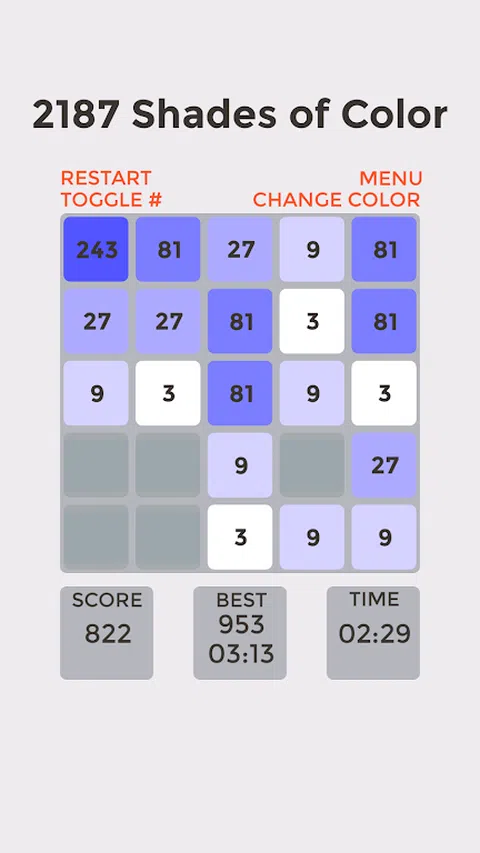 如何: 向上、向下、向左、向右滑动以移动卡片。触摸三张相同编号的卡片将它们合并: 3+3+3=9 9+9+9=27 . . 2187 当您达到 2187 时,您就赢了! 特征 : - 高分 - 清晰简单的用户界面 - 简单的控制 - 游戏适用于 android 2.3