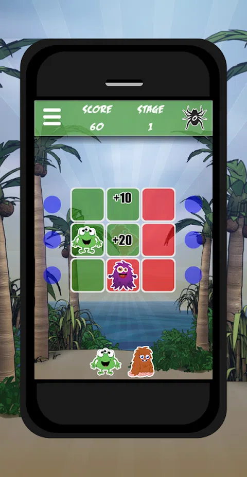 尽可能有策略地将怪物移动到场上,如果有两个或三个相互重叠,它们就会消失。这样,田野中的红色方块就消失了。通过一次清除多个块获得奖励积分。随着每个级别的达到,有更多不同的怪物,所以它变得越来越困难。保存蜘蛛,如果你被卡住,你可以用它作为通配符来摧毁它们。尝试上高分排名
