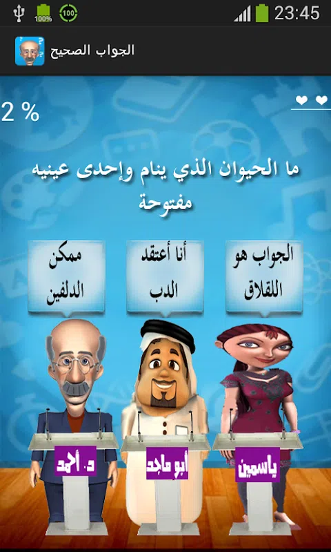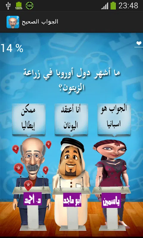 游戏《正确答案》是一款纯阿拉伯语界面的游戏,结合了娱乐性,除了获取知识和文化外,一切都在有趣、有趣的氛围中,这是因为游戏所基于的角色,其特点是有趣和有趣的角色。 第一个角色是艾哈迈德博士,一位拥有丰富文化和知识的大学教授,但他的记忆有时会出卖他^-^ 第二个角色:阿布·马吉德:对经济和社会研究感兴趣的商人 Yasmine:对自然科学和旅行感兴趣的牙医 怎么玩: 首先,正如我们所说的,一个文化游戏,您将面临各种文化问题,您必须选择正确的答案,这是通过每个角色上方出现的内容,以便您从他们尝试的角色中出现有趣的短语说服你每个人的答案都是正确的,并且你必须确定正确答案的主人,这将伴随着声音和图形效果,使播放在辉煌的顶部