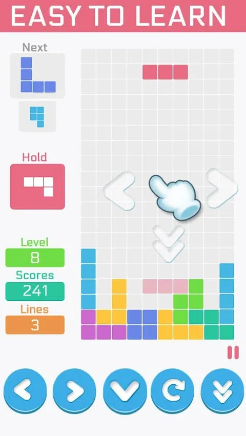 享受 2 种不同模式的游戏: 2. SPEED模式:以最快的速度清除20行。您可以控制级别以在此模式下调整块的速度
