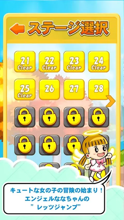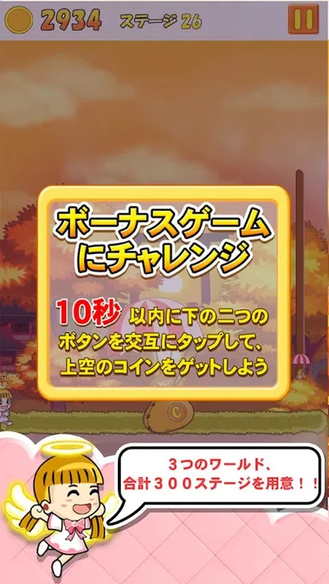 Choms 但适合! 横跳卷轴游戏出现! 共有30个阶段,10个阶段和3个世界! 可爱的天使“娜酱”出发去冒险! 以一二三、三段跳越山越谷,瞄准目标。 ? (内庄) 易玩 您可以通过点击屏幕跳跃♪ 如果你跳1、2、3和3次,你可以爬到高处♪ 如果您收集硬币,可以使用 gacha gacha 绘制 20 个朋友角色♪ 还有一个迷你游戏,你可以得到很多金币♪ 课程越来越难! 和“娜酱”一起跳吧!
