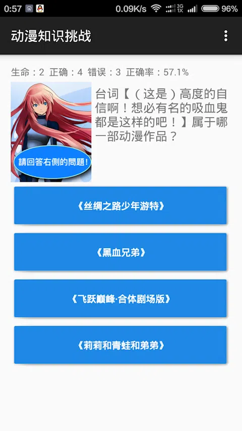 作为动漫达人的人,来挑战自己的动漫知识吧!游戏中收录了大量的动漫知识问答,涵盖动漫作品、监督、声优、海报、制作公司、动漫截图、动漫台词等各种知识问答题,答对加分,打错扣分,连续答对更有生命值的加成,来挑战自己的动漫知识吧。 游戏支持排行榜,得分会上传至排行榜中,看看你的动漫知识在全球动漫迷中能排名第几