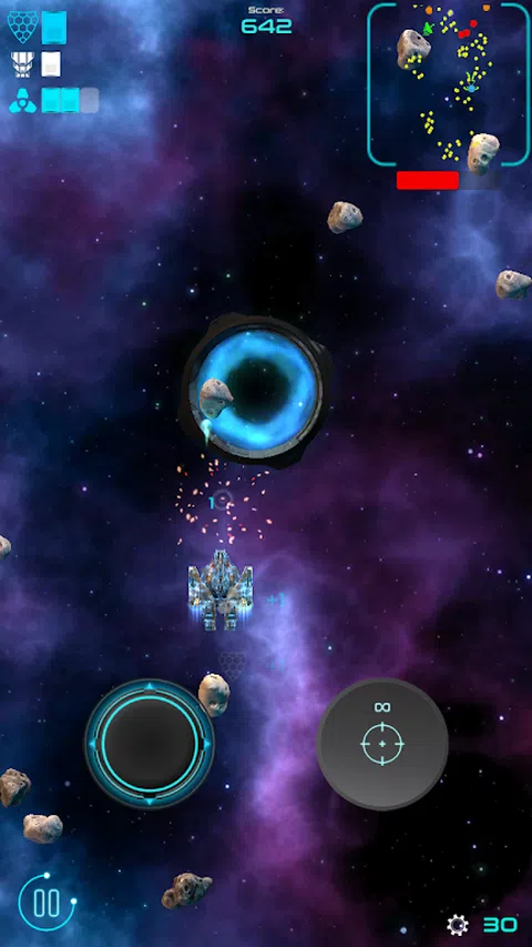现在是 3099 年,人类居住在远离地球的星系中,不得不面对新的挑战。敌人的 Norauxis 战列舰攻击 Humanium Federation。 驾驶你的战舰通过具有挑战性的关卡,拯救 Humanium Federation 免于毁灭。联邦战斗站将协助您进行冒险。借此机会请求战斗站升级您的飞船。战斗站也可以用来摧毁敌方战舰。 您可以在战斗站中为您的机载武器、激光炮和火箭发射器配备额外的属性。使用战斗站修复战列舰的损坏。你的保护盾将帮助你在敌人的攻击浪潮中幸存下来。避免与 Asteorids 相撞,并用精准的火力爆发摧毁它们。以这种方式收集的奖励积分会让您遇到一个非常具有挑战性的对手(奖励级别)。当心激光无人机,它们拥有致命的火力!巧妙地躲避攻击波,并用战术反击出其不意地打击你的对手。 战斗站将向您发送跳跃门,以便您可以将您的战舰带到另一个星系,那里有新的、更有趣的冒险等待着您。摧毁 Norauxis 船只将释放装有重要设备的容器,您可以拾取这些容器以提高战列舰的效能。 - 用你的战舰保卫人类联盟