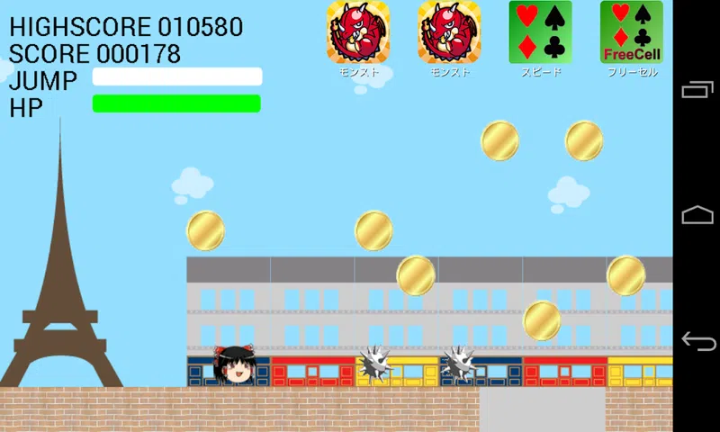 游戏从触摸开始。 跳的时候有跳表, 当跳跃量表达到 0 时,您将无法再跳跃。 如果您不跳跃,跳跃量表将自动恢复。 如果你击中荆棘或击中从右侧飞来的子弹,你会受到伤害, 健康计量表减少。 当体力计达到0时,游戏结束。 点击跳跃并拿硬币来增加你的分数。 如果你有一颗心,你的健康就会恢复。 触摸目标清除舞台