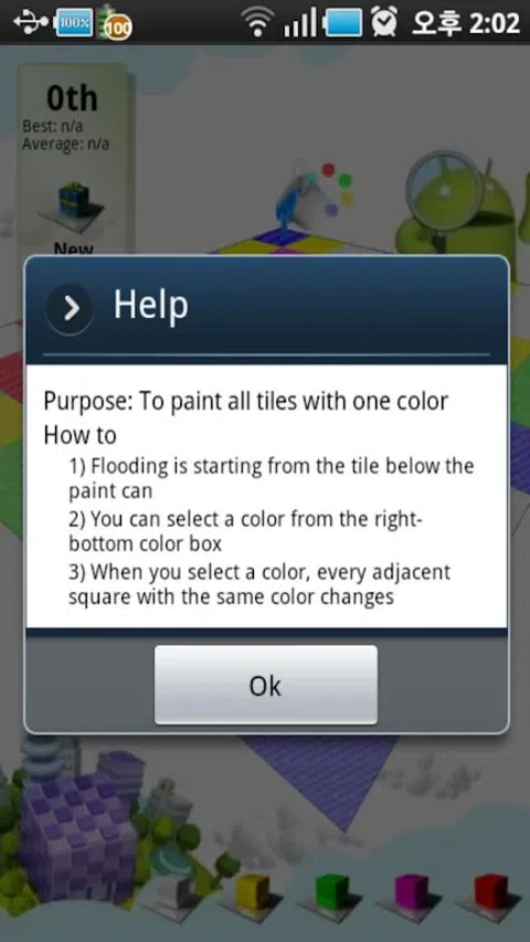 在允许的步骤内用一种颜色填充整个电路板。您可以通过选择左侧的一个彩色球从瓷砖开始前进。 这个令人上瘾的游戏被修改为 Android 的 3D 版本。只需点击屏幕! 按【菜单】键进行设置。 可以调整难度、板子大小等