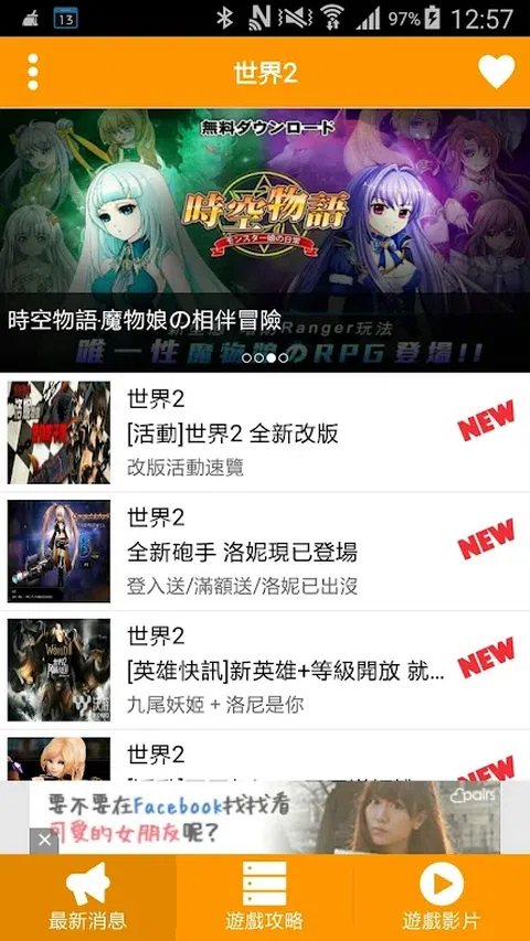 手游地带:世界2攻略是一个提供玩家,世界2的新闻.攻略以及影片的APP,透过这个APP,让玩家能够快速的了解游戏目前的现况。创世神攻略也提供了推播的功能主动去通知玩家最新的讯息和我的最爱功能帮玩家去收集自已喜欢的内容文章,帮助玩家破关