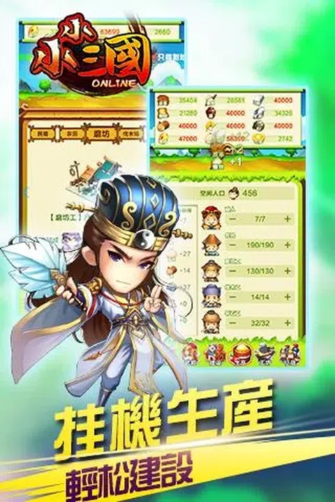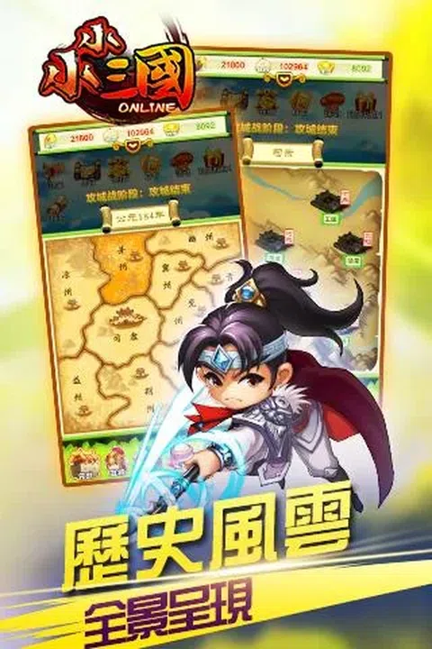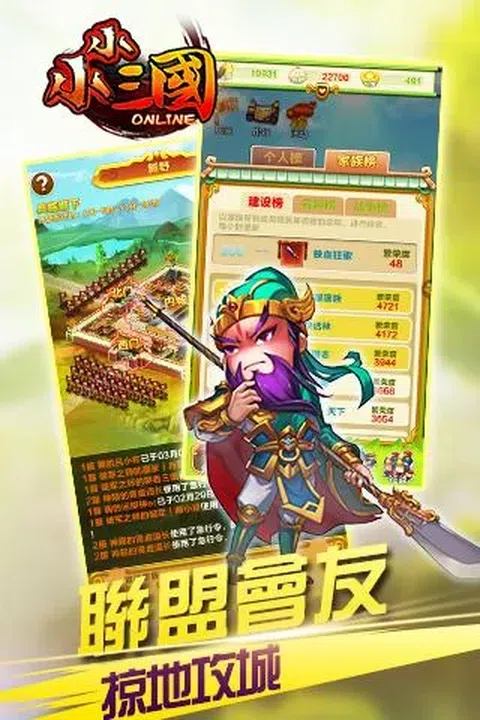 =游戏简介=☆最休闲的策略战争手游☆ 2016年最休闲的三国策略战争手游《小小三国》重磅来袭! 最萌的Q版武将,最休闲的策略玩法,最欢快的游戏节奏,打造最与众不同的乱世三国。 《小小三国》独创休闲策略玩法,一边是培养军队,保卫家园;一边是兵种相克,智计无双;转瞬却是激萌画风,欢快音乐,让你在欢乐的游戏节奏下轻松实现攻城掠地、称霸天下的英雄梦。 史上最新颖的三国之战已正式开启,千万玩家邀你共聚三国时代成就无双霸业! =游戏特色= 【萌三国 激萌画风打造别样三国】 游戏采用Q版萌系画风,呆萌可爱的三国武将,清新动人的乱世红颜,共同打造一个别具风格的三国世界! 【趣三国 欢快节奏助力趣味玩法】 欢快的背景音乐,可爱的角色配音,营造了一个轻松愉悦的游戏节奏,加上游戏内丰富的趣味玩法,足以让你有一场与众不同的三国之行! 【聚三国 千万玩家共建家园领地】 千万玩家共聚三国时代,白手起家创建家园,通过自己的努力建设家园设施,壮大实力,为征战三国奏响号角! 【智三国 智谋无双掌控乱世战局】 盾克弓,弓克枪,枪克骑,骑克盾,不同兵种相互克制,行军作战谋算天下,于乱世之中实现雄才伟略! 【战三国 招兵买马共赢大好河山】 招募三国武将,培养个人军队,一朝养成,伴你屠戮三国群豪,天下之大,山河秀丽,全都任你行走! 【统三国 征战天下实现王者霸业】 三国大军纵横宾士,英雄猛将横刀立马,保卫家园,征战天下,一将功成,三国霸业唯你而已!