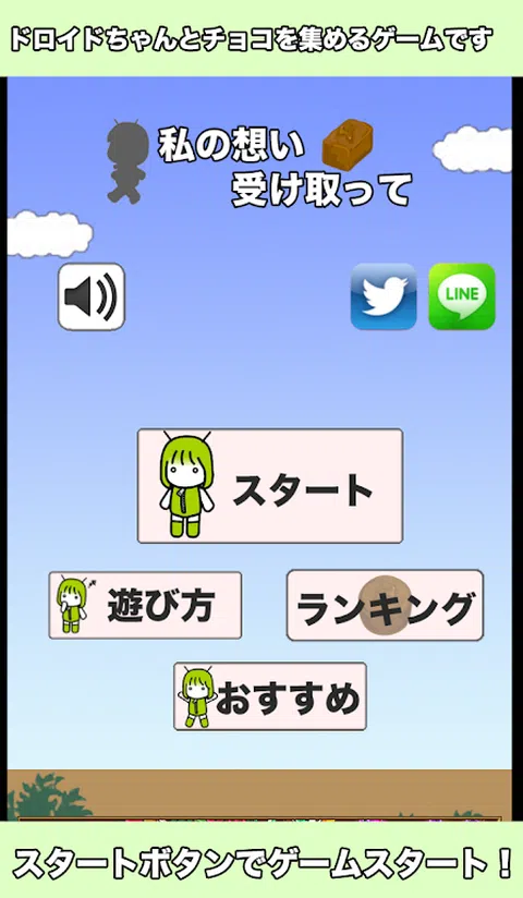 说到情人节,巧克力! 这是一个可爱的机器人收集巧克力的迷你游戏。 ◆这是一个小游戏,你可以收集从上面掉下来的巧克力。 ◆ 怎么玩 ①点击开始按钮开始游戏! ②点击屏幕左右移动机器人。 ③ 在30个时限内收集巧克力,争夺分数的游戏。 ■ 音乐:恶魔之魂 可爱的 droid-chan 是收集巧克力的迷你游戏。 ◆ 收集从上面掉下来的巧克力的小游戏。 ◆ 怎么玩 ① 点击开始按钮,游戏开始! ②点击屏幕Droid Chen会左右移动