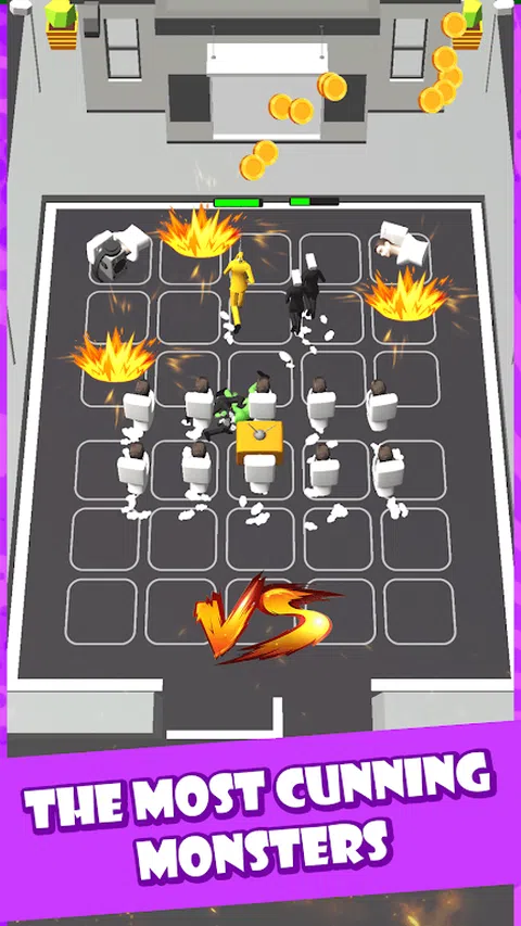 欢迎来到 Merge Monster Survival War(合并怪物生存战争)的世界:该游戏可以合并怪物以创造更强大的怪物并解锁更高级别。 在这个游戏中,你需要合并相似的怪物来创造新的、更高级别、更强大的怪物。创建并合并越来越多的怪物,使您的怪物军队越来越强大。 简单的游戏方式: - 拖动 2 个相同的怪物,形成一个新的、更强大的怪物。 - 安排你的怪物军队打败你的对手。 加入合并怪物生存战争,体验两支厕所怪物军队之间的战斗