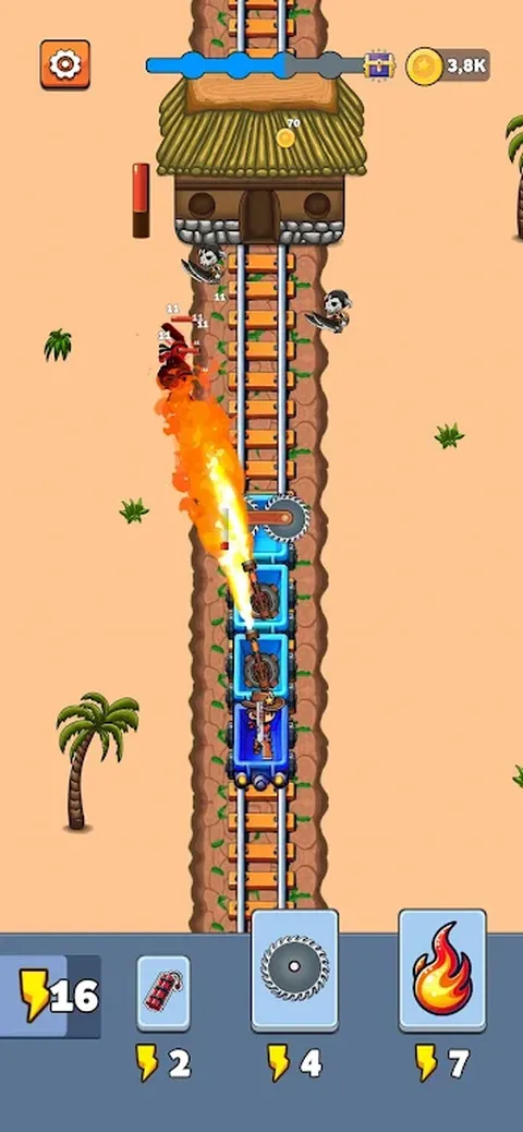 一款激烈的防御游戏,您必须不惜一切代价保护您的火车免受无尽敌人的攻击!在这个游戏中,你的火车不仅仅是一种交通工具,它还是你的移动堡垒。 游戏机制: 作为一个强硬的牛仔,装备着霰弹枪和炸药棒,你需要通过建造和升级不可阻挡的战斗列车来击退一波又一波的敌人并摧毁他们的基地!每辆火车车厢都可以容纳毁灭性的炮塔,如锯、激光、火焰喷射器和迷你炮。 升级和策略: 自定义你的火车:添加新车并增强其抵抗力,以更长时间地抵御敌人的猛攻。 炮塔和道具:在每辆车上放置不同的炮塔,并单独升级它们以增加其威力。每个炮塔都有一个独特的道具,您可以使用能量系统激活。随着时间的推移积累这种能量以释放特殊攻击并改变战斗进程! 能量系统:每隔几秒获得能量点以触发道具并激活牛仔的特殊能力。投掷炸药棒,从远处消灭成群的敌人! 目标: 保卫你的火车免受敌人的攻击,并在他们到达你的基地之前摧毁他们的基地。使用策略,升级你的防御,尽可能长时间地生存!