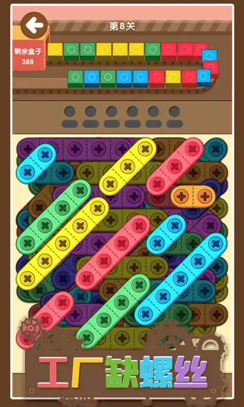 这是一款将螺丝拧到盒子上的益智游戏,游戏方法为点击板子上的螺丝,螺丝会全部被拧下来,再按照工厂流水线上的盒子的颜色拧上螺丝,即可完成盒子加工,全部加工完成即可过关。随着游戏的进行,螺丝颜色也会越来越多,快来挑战一下吧。