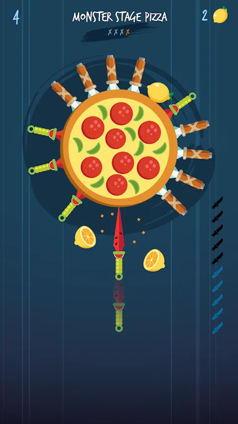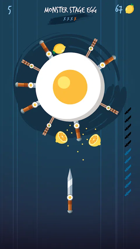 玩家向旋转的木圈投掷刀具,试图耗尽他们的刀具供应(从而破坏目标并进入下一阶段)。 但是你不能两次击中同一区域的刀。 如果一把刀碰到另一把刀,游戏就结束了。 碰巧坐在目标上的分裂柠檬可以获得硬币积分,以后可以用来购买不同类型的刀。 掌握快速敲击的艺术,尤其是在第一个 Boss 之后的关卡中,当您需要非常快速地吐出一些刀时。 您可以将刀子彼此非常靠近地扔,因此请利用快速投掷的优势,以防止在回合后期不得不返回并填补小间隙。目标旋转得越快,您可以越快点击。 由于有时不稳定的轮换,它可能看起来很艰难。 Knife Strike 的玩法完全基于你打破木制目标的反应,但是当你失败(你会失败)时,你会立即想再试一次。 这是一个消磨几分钟的完美标题。 玩起来非常简单,点击屏幕向旋转的木头射击刀具以破坏它们。时间是最重要的,因为你不想击中你已经扔掉或已经扔到那里的刀,你做得越远,关卡就越难。 小心地扔刀,准确地击中目标。我们只提供 3 次的继续机会。 作为一款免费游戏,会弹出不少广告。我们试图设法不影响移动广告中断或减慢游戏速度。 愿刀力与你同在