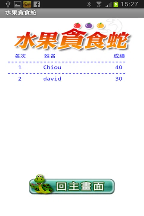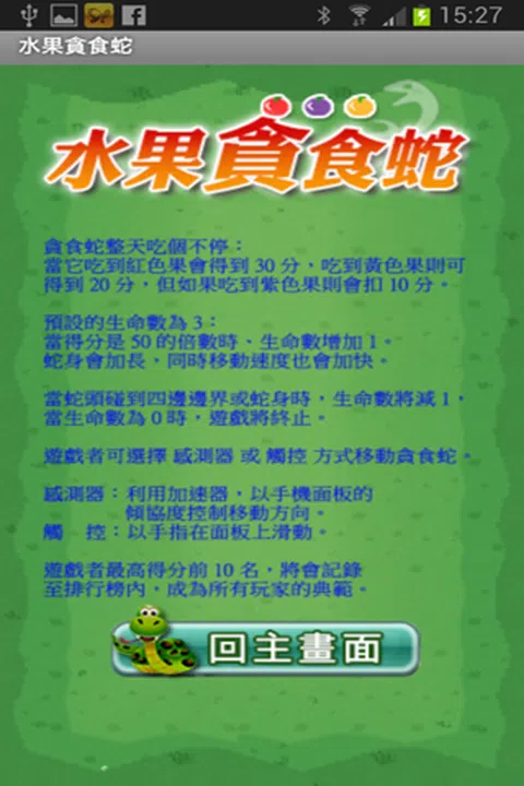 贪食蛇整天吃个不停: 当它吃到红色果会得到 30 分,吃到黄色果则可 得到 20 分,但如果吃到紫色果则会扣 10 分。 预设的生命数为 3: 当得分是 50 的倍数时、生命数增加 1。 蛇身会加长,同时移动速度也会加快。 当蛇头碰到四边边界或蛇身时,生命数将减 1, 当生命数为 0 时,游戏将终止。 游戏者可选择 感测器 或 触控 方式移动贪食蛇