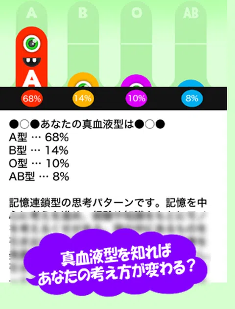 你的血型真的匹配吗? 你有没有被告知,即使你是 A 型,你也是 O 型? 人们的个性和思维模式会随着他们出生和成长的环境以及他们的经历而改变。 血型是“思维”和“个性”的区别。 “真血型兼容性诊断”从你的思维模式诊断真血型。 此外,您可以从您的真实血型中找出兼容的血型