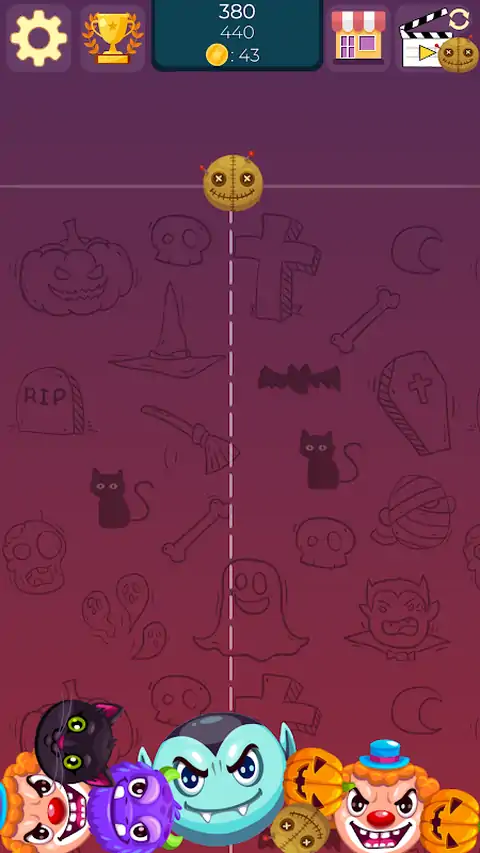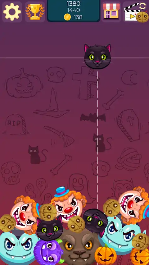 赶快推出这款全新的万圣节怪物融合游戏吧!南瓜、狼人、吸血鬼和僵尸都在等着你!尝试打开所有怪物! 连接怪物会获得金币。您可以使用硬币解锁商店中的新怪物。 连接时新怪物会获得更多积分,因此有机会提高您的记录! 主要目标是解锁所有怪物并在排行榜上占据第一名。 展示您连接怪物的技能和灵巧! 上面的游戏场上显示了一个怪物,它必须掉落。 您的任务是将怪物扔下游戏场,同时尝试让它击中同一个怪物。当两个相同的怪物接触时,会出现一个更大的新怪物。 如果整个游戏区域填满并且怪物超出顶线,则游戏会话将丢失。 连接怪物会获得金币。它们可以用来解锁商店中的新怪物。 可以改变观看视频广告的怪物!