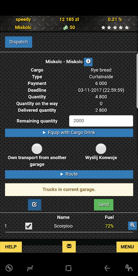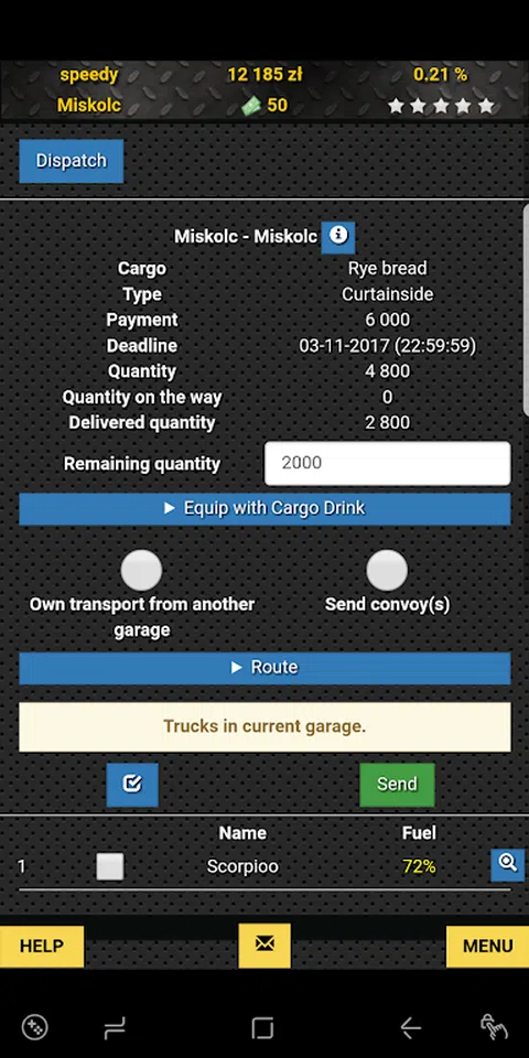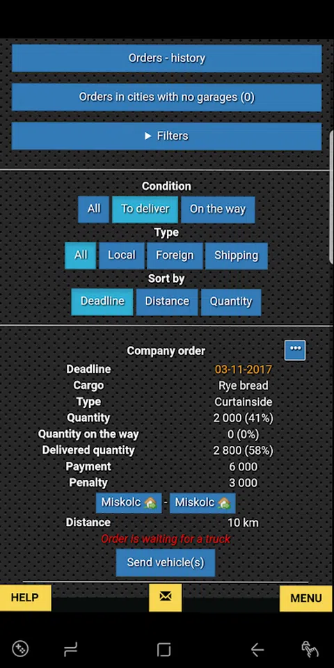 游戏提供了几种不同类型的卡车和拖车,您可以使用它们来运送货物。当您订购它们时,您可以选择要应用的颜色或图案。对于某些车辆,您可以选择不同版本的发动机,这将改变车辆的规格并使卡车更有用。这还不是全部。您必须在选择订单时做出正确的物流决策,接受最有利可图的订单,这样您的余额就不会为负数。您必须确保按时完成交货,否则您将支付罚款。 这是玩游戏的一种形式