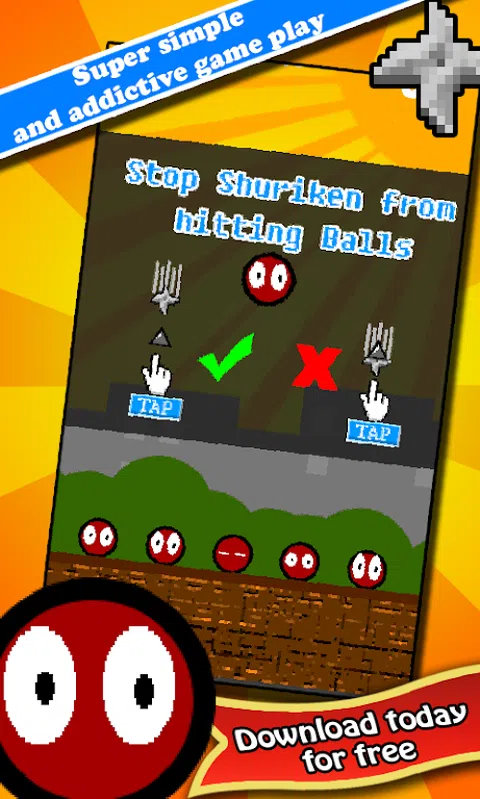 立即免费下载 - Bouncy Bouncing Shuriken Ball 拯救你弹跳的红球朋友并阻止忍者刺客手里剑星。在手里剑杀死它们之前点击每个红球上方以产生尖刺。你有 5 条生命。在这个令人上瘾的简单游戏中疯狂地点击。 特征 ★超级上瘾和简单的游戏。 ★ 保存你的最高分。 ★ 伟大的NES / SNES 风格的图形。 ★ 可爱的 8 位风格音乐。 通过评价 Bouncy Bouncing Shuriken Ball 来表示您的支持