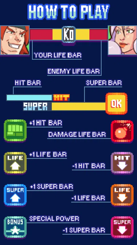 像素艺术好旧的风格,你所要做的就是快速点击正确的物品来击败你的敌人!但要小心,如果你点击了错误的,你会被击中,你可能会被打败! -1 个可玩角色(而不是完整版中的 3 个); -4 个要击败的敌人(而不是完整版中的 9 个); -没有奖励阶段(完整版中有3个奖励阶段); -1 最终 Boss 很难击败; -1 结尾(而不是完整版中的 3); -没有特别的秘密结局 -没有可用的货币系统和保存状态; -没有用金钱征服的成就; -没有艺术画廊 -没有生存模式