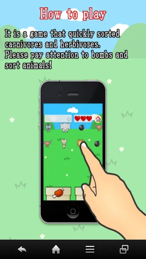 这是一个快速分类食肉动物和草食动物的游戏。 规则很简单!左边盒子里的肉食动物, 如果你是草食动物,把它放在右边的盒子里! ■ 怎么玩 请将左右流动的动物分为肉食动物和草食动物。 只需触摸动物并将其拖到盒子上