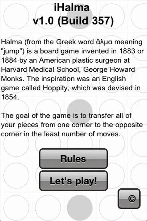 Halma 是 1883 年或 1884 年由哈佛医学院整形外科医生 George Howard Monks 发明的棋盘游戏。灵感来自于 1854 年设计的名为 Hoppity 的英国游戏。 游戏的目标是以最少的步数将您所有的棋子从一个角转移到对角