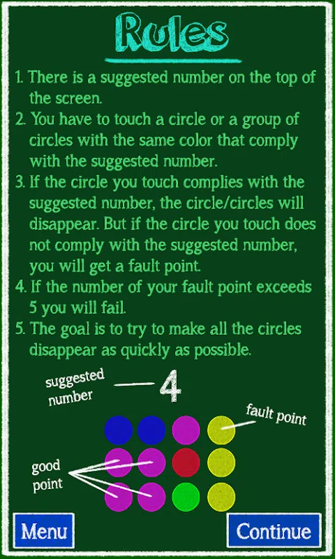 如何玩: 1.屏幕顶部有一个建议的数字。 2.您必须触摸一个或一组颜色相同且符合建议数字的圆圈。 3.如果您触摸的圆圈符合建议的数字,则圆圈将消失。但是,如果您触摸的圆圈不符合建议的数字,则会出现故障点。 4.如果您的故障点数超过5,您将失败。 5.目标是尝试使所有圆圈尽快消失