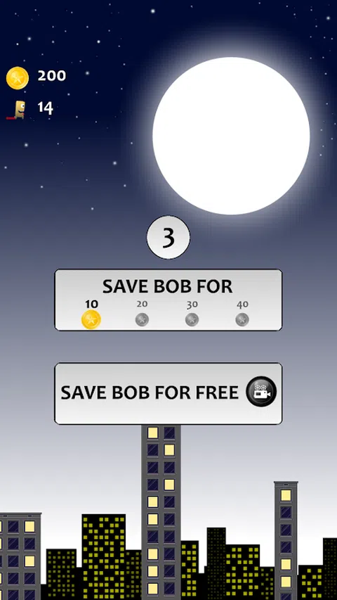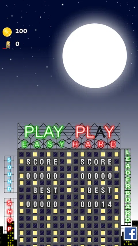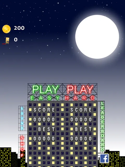 一般的 就像其他怪物一样,鲍勃害怕下面街上的人。他唯一的救赎就是从一栋楼跳到另一栋楼以度过夜晚。从屋顶收集一些金子,如果鲍勃错过了一次跳跃,它们可以用来救他。 帮帮他! 不同的困难 您可以从两种不同的游戏模式中进行选择,其中 HARD 级别可能是一个真正的挑战。 EASY 和 HARD 之间的区别在于房屋。 EASY 上有更多更宽的房子,这使得 EASY 更适合孩子们,也许也适合那些以前没有玩过很多游戏的人。 你怎么玩 选择 EASY 或 HARD 后,就可以开始演奏了。您只需将手指放在屏幕上即可。通过这样做,你会看到一个权力圈在增长。手指按住的时间越长,力量圈越长,跳跃的时间就越长。让 power circle 达到最大值总是会导致比屏幕更远的跳跃,并导致 Bob 致命的跳跃。为这种跳跃机制获得正确的感觉可能需要几次跳跃,但不要放弃! 金子! 在一些房子上,有人掉了一枚金币。这些金币可以由我们的怪物鲍勃在他降落在房子上时收集。收集到的金币可以用来拯救鲍勃。如果这种情况不会经常发生,那么鲍勃会在时错过一所房子,拯救他的可能性出现了。您将看到一个保存 Bob 按钮,并有三秒钟的时间来决定是否保存 Bob。但这将花费您 10、20、30 或 40 金币,具体取决于您在当前游戏会话中已经救了他多少次。第一次救他需要 10 金币,然后是 20,然后是 30,最后是 40 金币,但不会超过这个。 菜单屋 - 在第一个屏幕上,您会看到一个带有很多标志的菜单屋。上面的两个,“PLAY EASY”和“PLAY HARD”已经在上面解释过了,与你想要什么样的挑战有关。 - 然后是声音标志。它simple 打开或关闭声音。 - 如果我们再次查看菜单栏,我们可以看到不同的分数标志。在左侧和顶部显示 SCORE,这是您在 EASY 级别的最后一场比赛结果。在此之下,您将在 EASY 上获得最佳结果。在右侧,您有相同类型的信息,但对于 HARD 级别。 - 如果您喜欢 Jumping Bob: House Adventure,您可以通过在 Google Play 上对游戏进行评分来证明这一点。底部和中间的闪亮星星一键带您进入 Google Play。 游戏资讯 在游戏过程中,您可以看到一些关于您的游戏的信息。在左上角,您会看到一枚金币。那就是你拥有的金币总量。这些是当你想救鲍勃时你使用的硬币,当他错过了一次跳跃和从房子上摔下来时。在该信息下,您有一个正在跑步的小 Bob 告诉您您在当前游戏会话中跳跃了多长时间