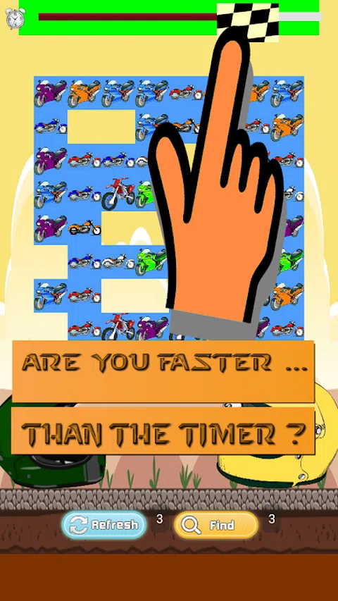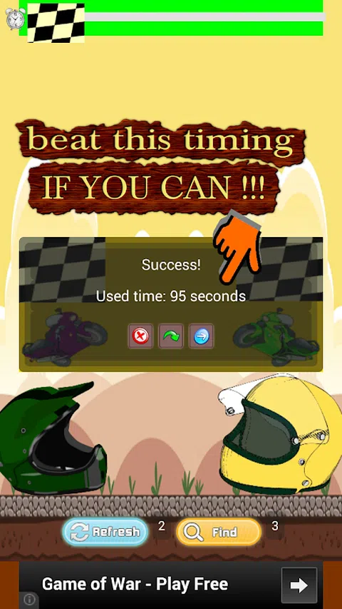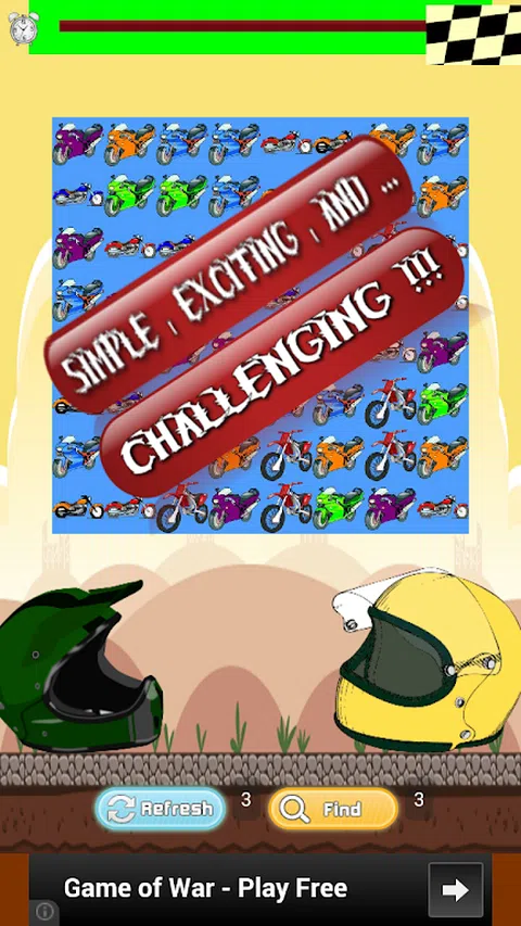 Bike Racing Games 2014 是一款限时三轮配对游戏,可免费下载。 2014 年自行车赛车比赛的第一轮是 100 秒,之后的每一轮都减少 10 秒,因此将有时间改进每一轮的倒计时计时器。 Bike Racing Games 2014 的另一个激动人心的功能使其比配对游戏更棒 – 您必须找到以某种方式在一起的图标!当您进行匹配时,Bike Racing Games 2014 将显示。您还会在此过程中获得一些帮助。您可以使用刷新按钮 3 次;这会混淆游戏卡,因此更容易找到匹配项。您也可以使用 FIND 按钮 3 次,这将为您找到匹配的。 2014 年自行车赛车比赛是一场令人上瘾的比赛,寻找每一轮都变得更难的匹配。玩得开心!