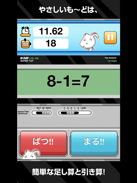 各位,今天心算了吗? 在超市购物时,比如荷兰人请朋友吃饭,我想心算是家常便饭。 但! 心算是不会很快的。我需要日常纪律。 那么,轮到 Crazy Calc 了! 心算训练,简称Crazy Calc! 看题目和答案要一道道题,瞬间或正确答案,找出是否答错,很爽快的休闲游戏! 可爱的兔子,会跟着颜色一起去枯燥的心算训练。 现在,让我们开始心算吧! ◆◇◆ 怎么玩◆◇◆ ▽答案正确吗?还是不正确? 会出现一个接一个的问题及其答案。如果答案正确,请按“マル”按钮,如果答案不正确,请按“bants”按钮。 一旦你习惯了做一道题,看起来节奏更好的答案就可以了。 ▽失误后立即结束游戏! 看向萌兔的习惯,答案排列的很严格。 我想知道如果你犯了一个错误就立即游戏结束的紧张局势,有多快的答案可能。让我们挑战心算的极限吧! ◆◇◆ 回顾◆◇◆ 意见,如要求,无论如何,请在评论中告诉我们