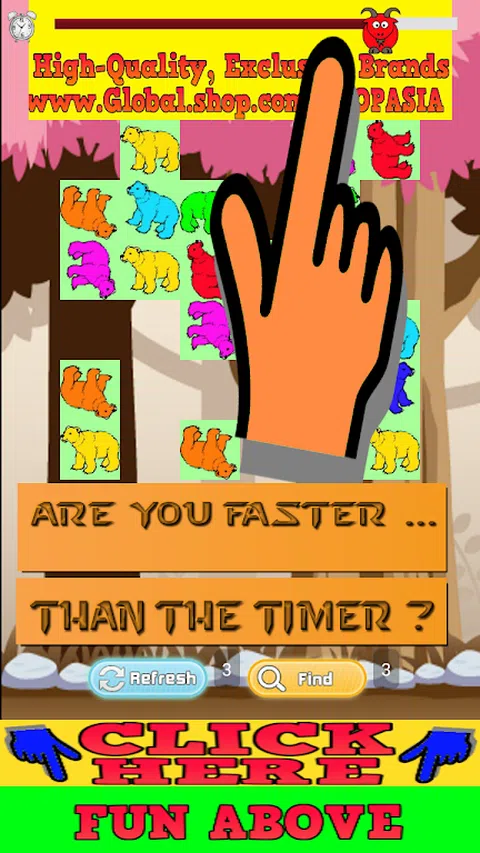 儿童免费熊游戏是一款定时三轮配对游戏,包括幸运的红色儿童免费熊游戏、海洋蓝色熊游戏免费、永恒的绿色熊游戏和亮黄色儿童熊游戏。 Bear Games for Kids Free 免费下载的第一轮为 100 秒,之后每轮减少 10 秒,因此将有时间改进每一轮免费的 Bear Games for Kids Free 游戏倒计时。 Bear Games for Kids Free 的另一个激动人心的功能使它比匹配的 Bear Games 更棒—您必须找到以某种方式在一起的图标!当您进行匹配时,Bear Games 免费版将显示。您还可以在 Bear Games 熊游戏中获得一些帮助。您可以使用 REFRESH 按钮 3 次刻录,这会混淆游戏卡,因此更容易找到匹配项。您也可以使用“查找”按钮 3 次,这将为您找到匹配的。这是儿童熊游戏,可免费下载。如果您正在寻找儿童免费熊游戏的理想选择,那就太好了。玩得开心 !