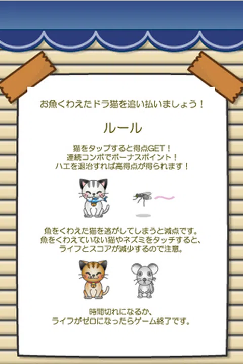 让我们吓跑那只用嘴抓鱼的猫吧! [怎么玩] - 通过点击猫,你可以吓跑猫。 - 打败苍蝇你会得到高分! - 如果你让带鱼的猫走,你会失去意义的。 - 尽量不要在没有鱼腥味的情况下敲击猫或老鼠。你会失去生命点和分数。 - 当你用完时间或生命值时,你就完成了