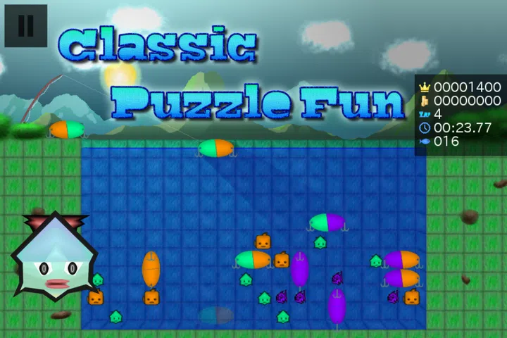 通过将至少四个相同颜色的鱼或鱼饵部分水平或垂直放在一起,捕捉位于田园诗般的山景中的池塘中的所有鱼。 饵料被扔到池塘中央,慢慢沉下去。 它们可以向右、向左或向下移动,并可以 90° 间隔旋转。 一旦建立了至少由四个部分组成的链条,所有相关的鱼都会被咬住并被拉上岸。 通过尝试获得更高的分数与他人竞争。在同一个动作中创建多个链条会奖励更多积分。 解锁难度越来越大的关卡,并参观难度各异的三个世界之一(完整版),每个世界都有一个独特的环境,有 20 个级别(完整版)。 (或者还有更多?) 你能解锁所有的成就吗? 或者甚至通过获得最多的分数登上高分榜单(排行榜)的首位? 这个游戏的一个特点是可选的立体视图,它允许你玩 3D 游戏。 为此,您必须将您的设备连接到 3D 电视,将其放入 VR 眼镜架或只是眯着眼睛