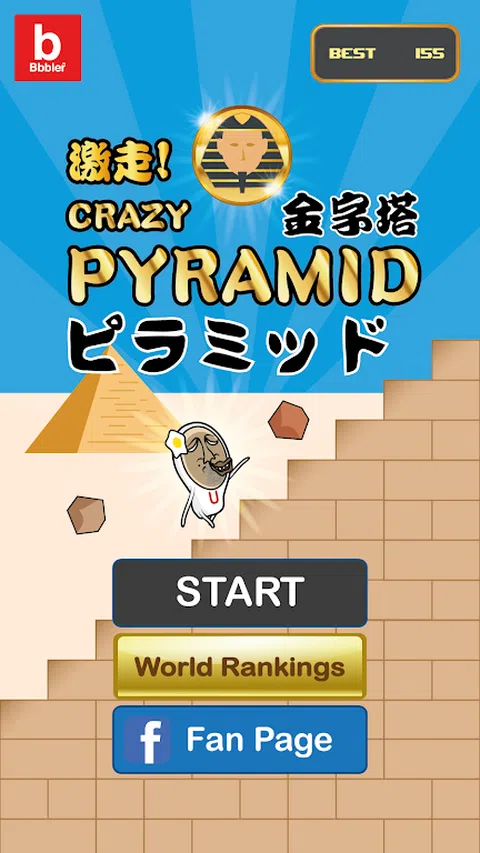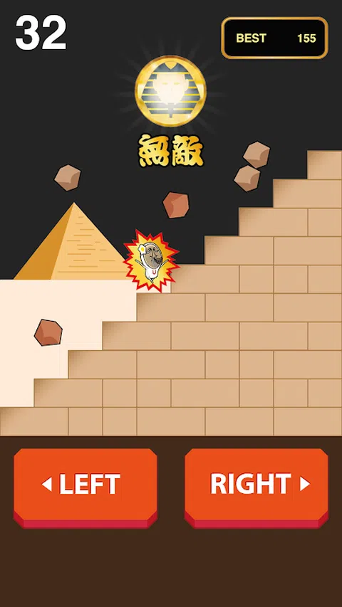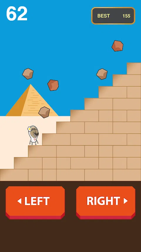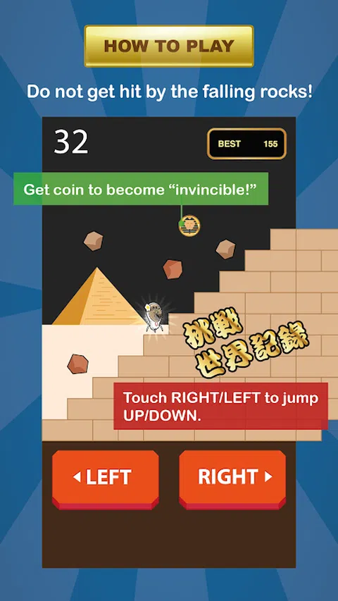 丑先生要爬上神秘的金字塔!一路上有落石攻击!快来帮忙丑先生闪躲所有的落石,登上金字塔顶端!挑战世界排名! Go! Go! Go! ■ How to play 点击左键或画面左半边来向下阶梯。 点击右键或画面右半边来向爬阶梯。 被落石击中游戏结束。 单键操作!玩法超简单! 挑战世界排名