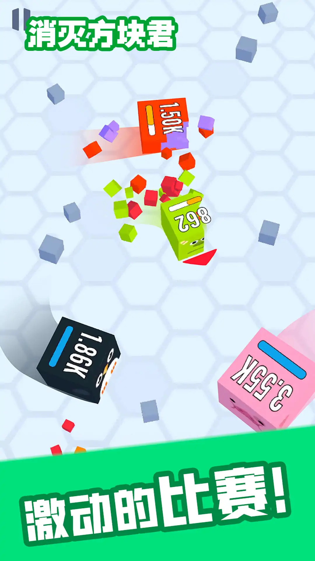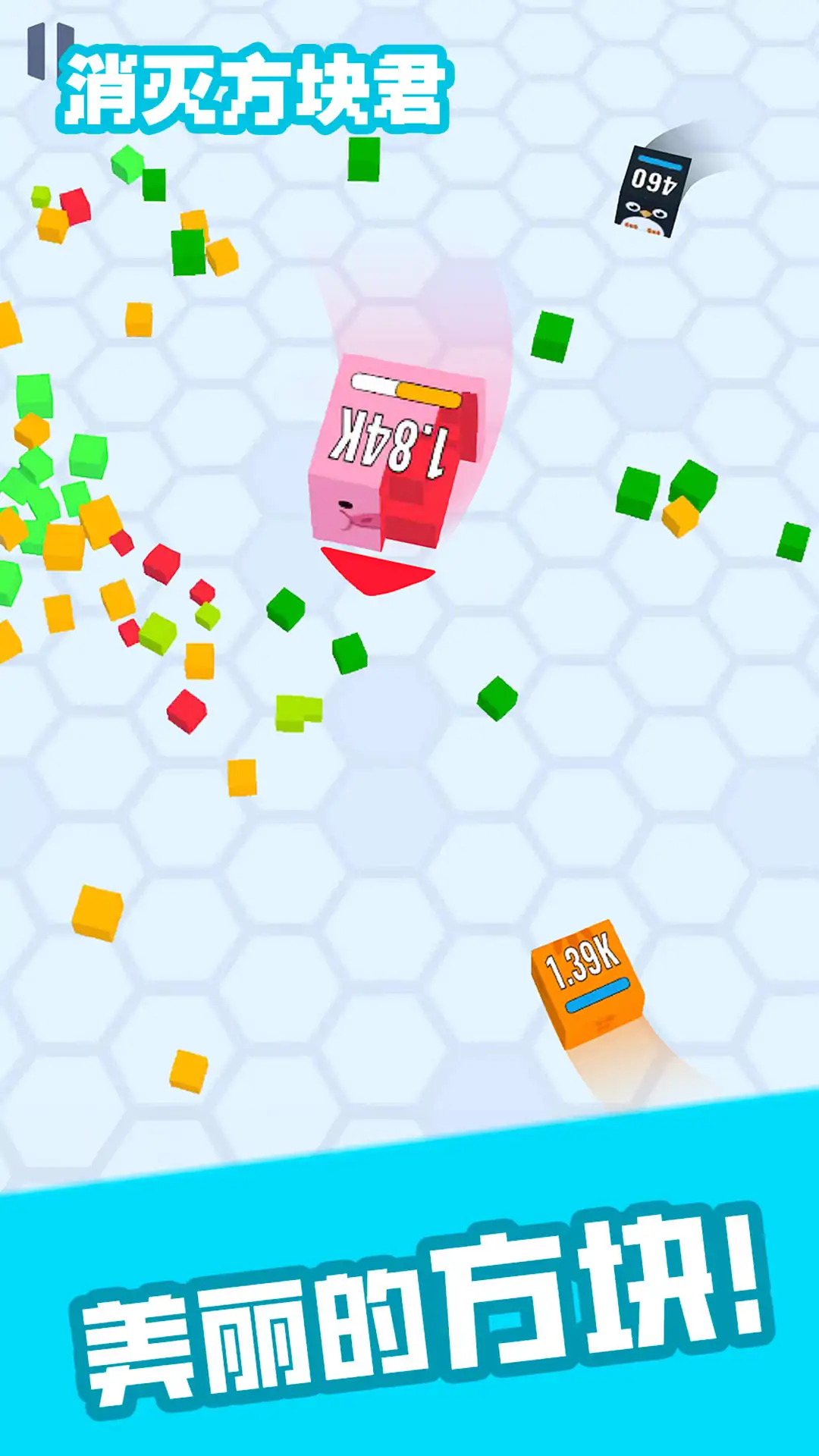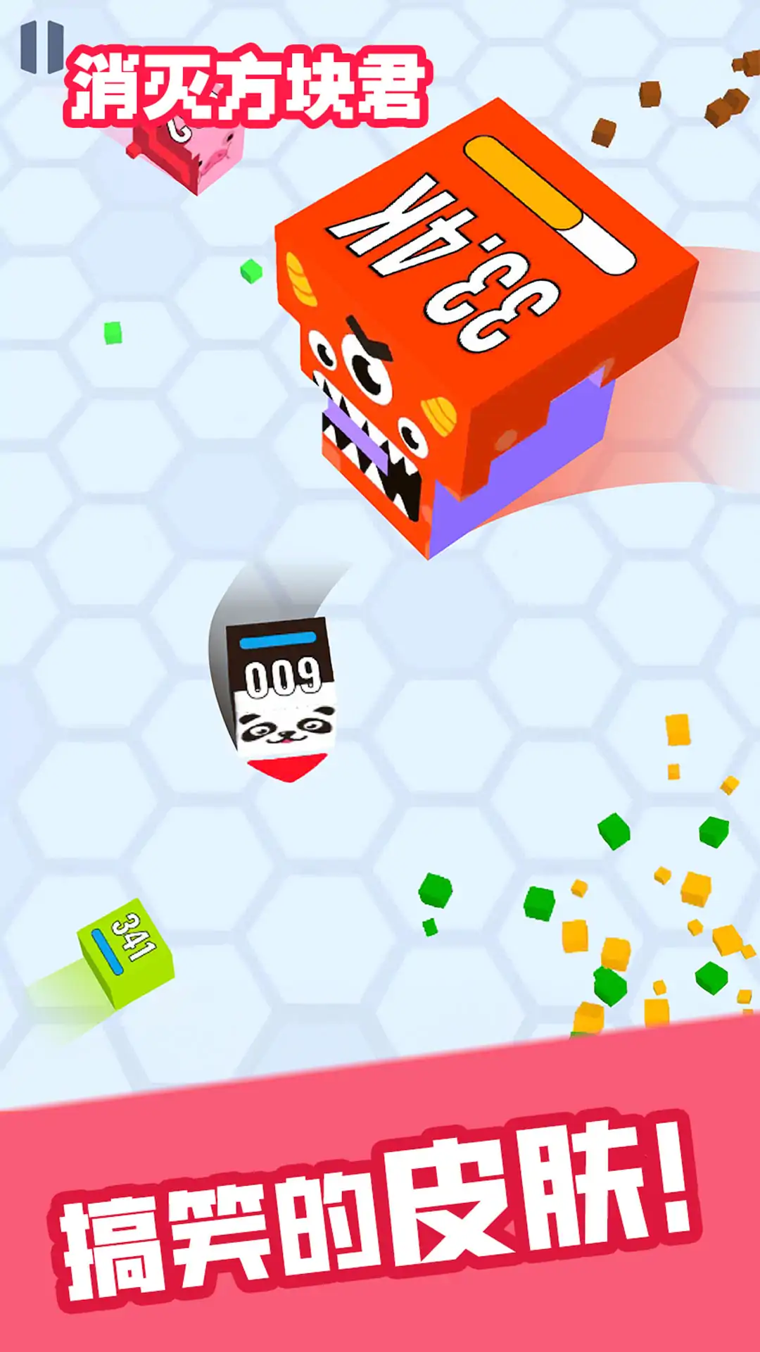 游戏中,玩家将操作一个可爱的小方块,在一个3D竟技场中和其它方块比拼。 游戏的规则简单而有趣,不断收集较小的方块,从而变大,同时也要注意躲避比你大的方块来袭。 击败对手可以获得金币奖励,一定数量的金币可以解锁有趣而时髦的皮肤, 快来立即下载,您一定会玩得很开心!