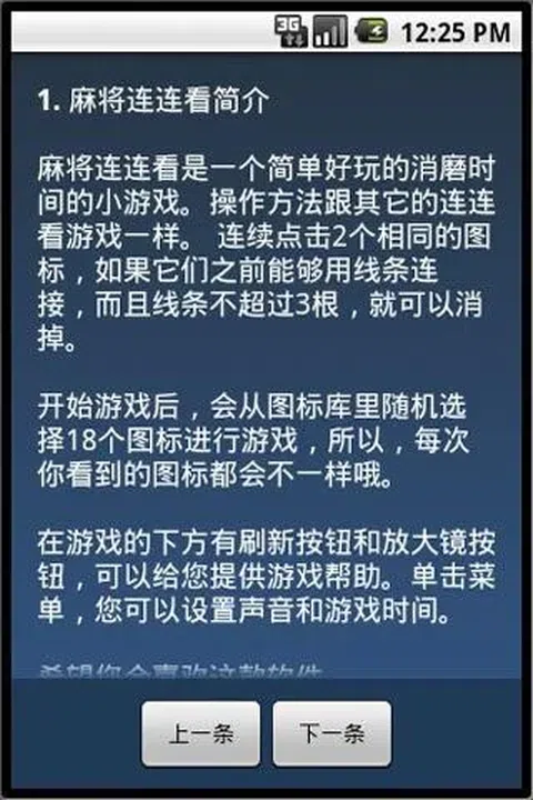 麻将连连看是一个简单好玩的消磨时间的小游戏。 操作方法跟其它的连连看游戏一样。 连续点击2个相同的图标,如果它们之前能够用线条连接,而且线条不超过3根,就可以消掉。 开始游戏后,会从图标库里随机选择18个图标进行游戏,所以,每次你看到的图标都会不一样哦。 在游戏的下方有刷新按钮和放大镜按钮,可以给您提供游戏帮助。单击菜单,您可以设置声音和游戏时间。 希望您会喜欢这款软件