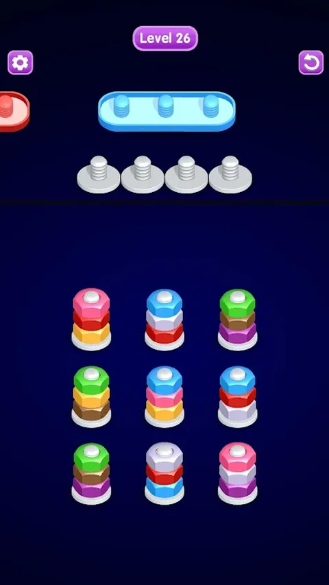 * 以正确的顺序拧开螺母。 将它们放入目标框中。 每个坚果都有独特的颜色,所以在拧开它们时要小心